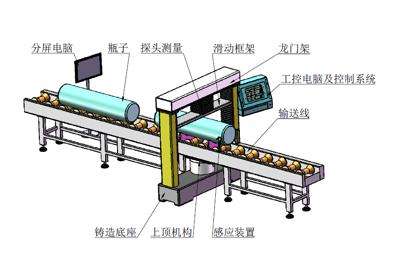 12)下料:儀器測量結束后,擋板自動下降,瓶子自動流入到流水線,下一產品自動進入,往復循環。