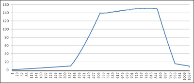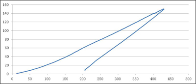 圖3 壓痕深度值隨時間變化(X軸單位:1/40秒;Y軸單位:微米) |