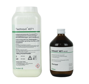Technovit 5071 與Technovit 4071基本構成和應用范圍大致一致,是Technovit 4071改進型,特性是其可溶,優異的粘結性能,故可用于需回收樣品的試樣制備,同時Technovit 5071也可用于工業領域金屬粘結和應力儀測試技術。2:1重量比粉液混合型,工作時間2分鐘,固化時間7分鐘,固化后可丙酮溶解型設計。 適用于貴金屬等需回收樣品的材料的鑲嵌。